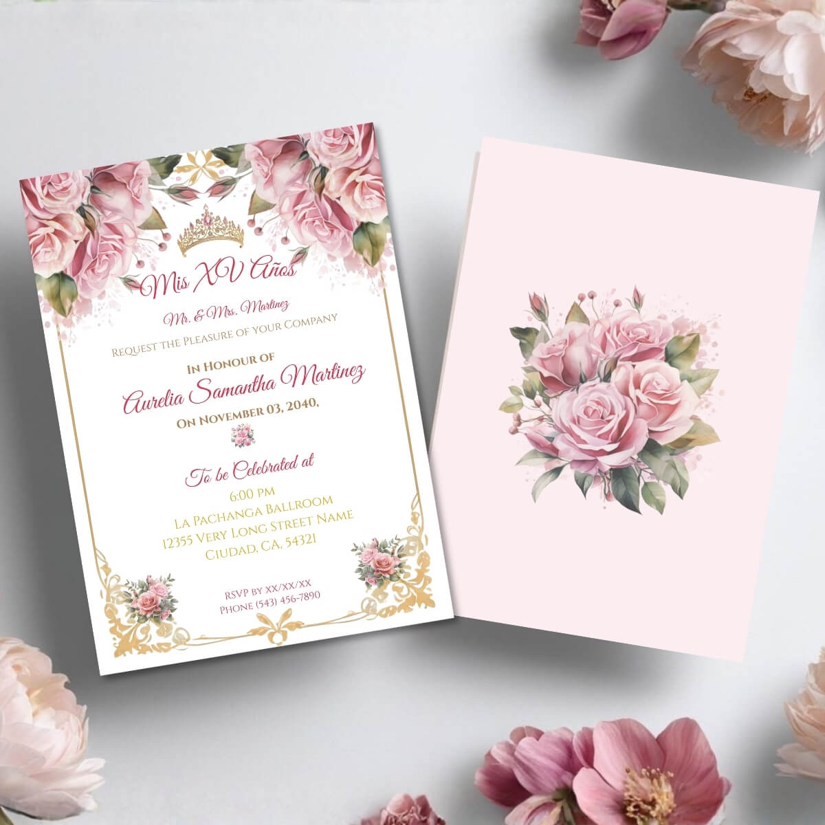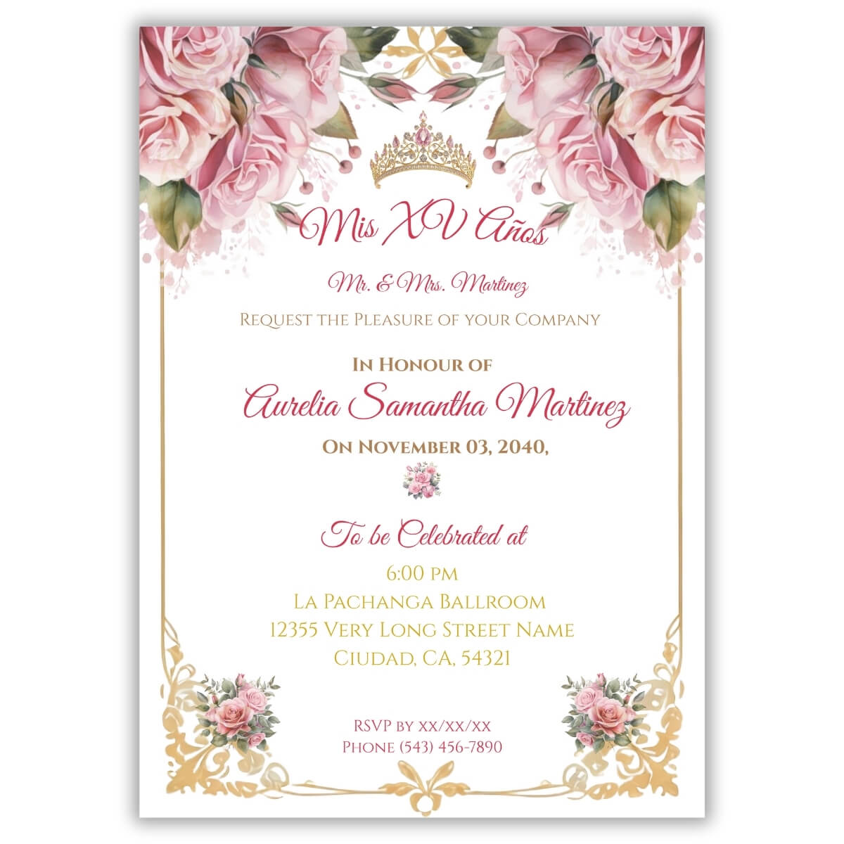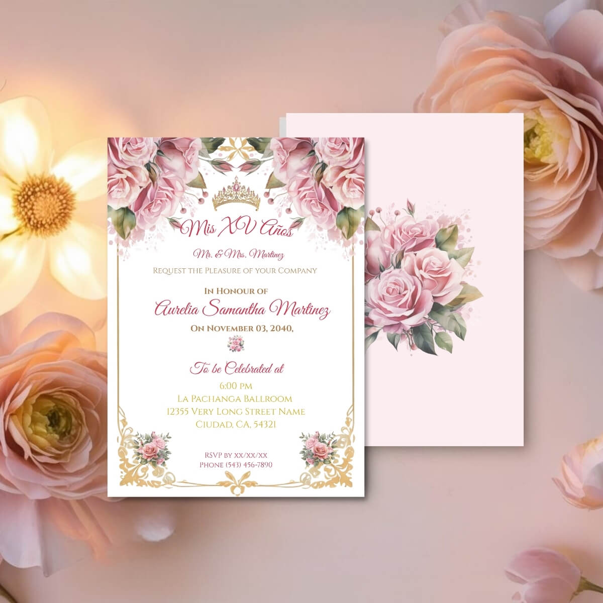 Dusty Rose Roses Quinceañera Invitation with Gold Frame (Printable Template)