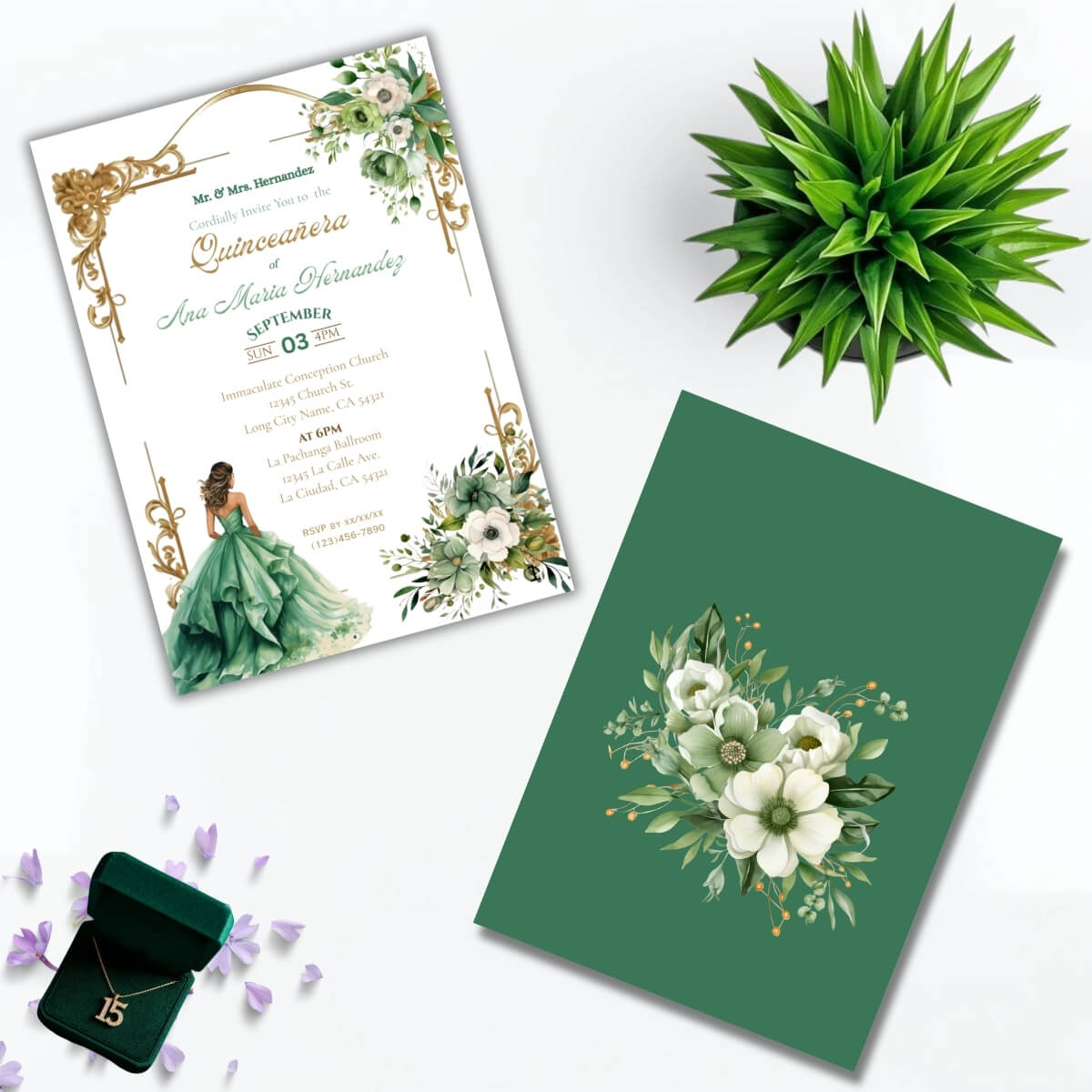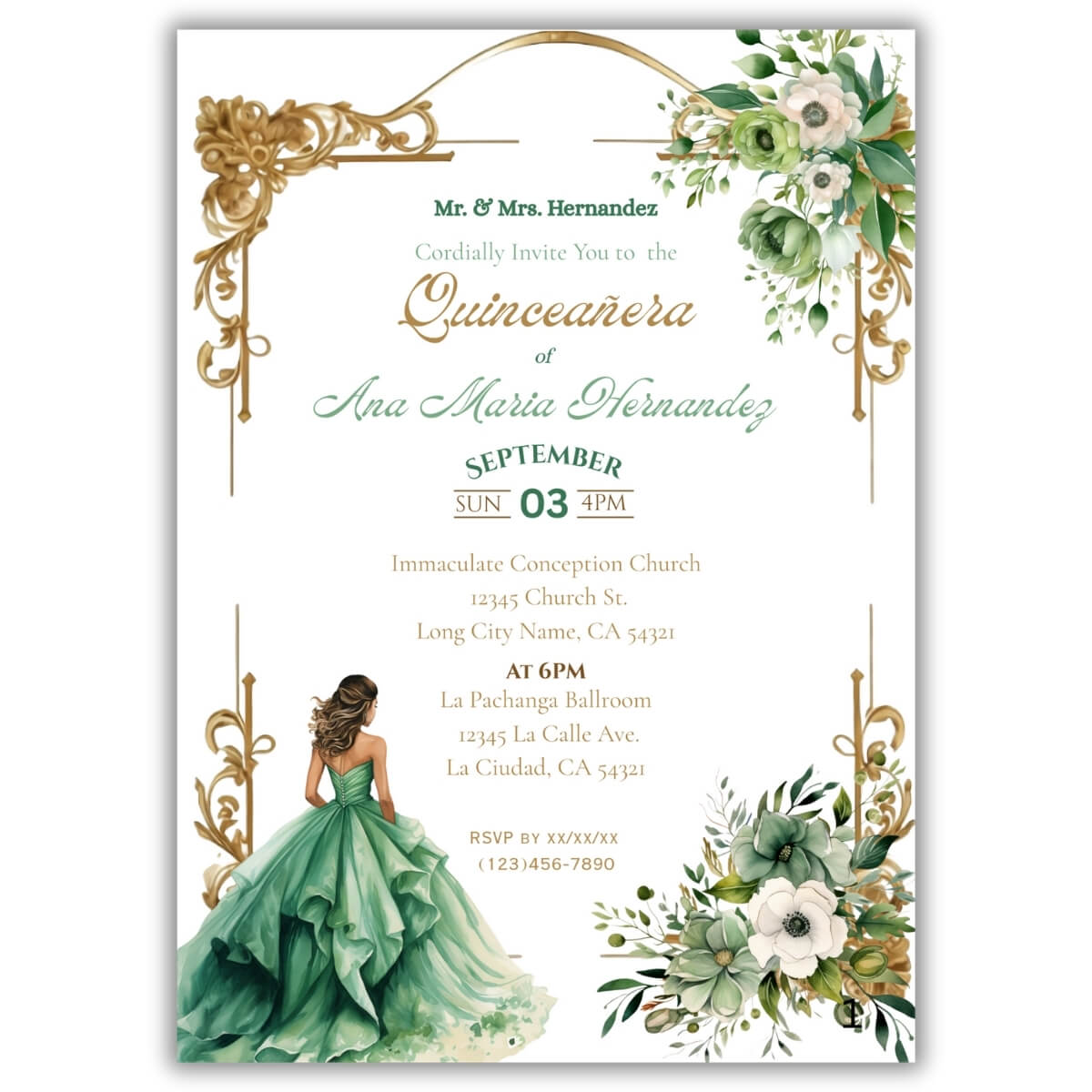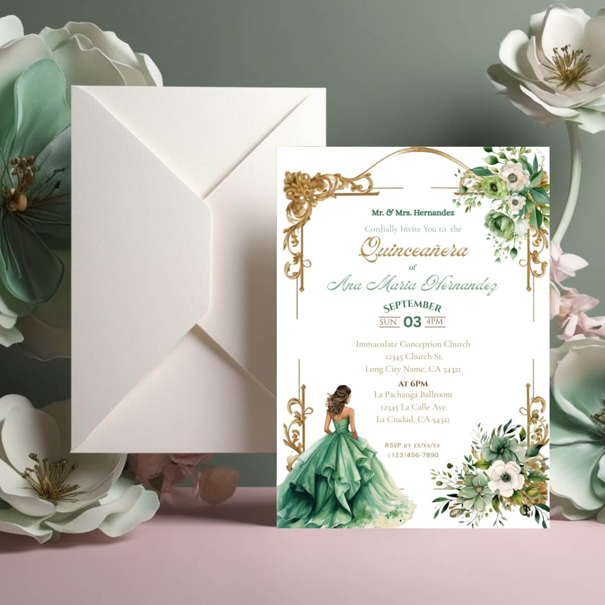 Green Sage Floral Quinceañera Invitation Printable Template