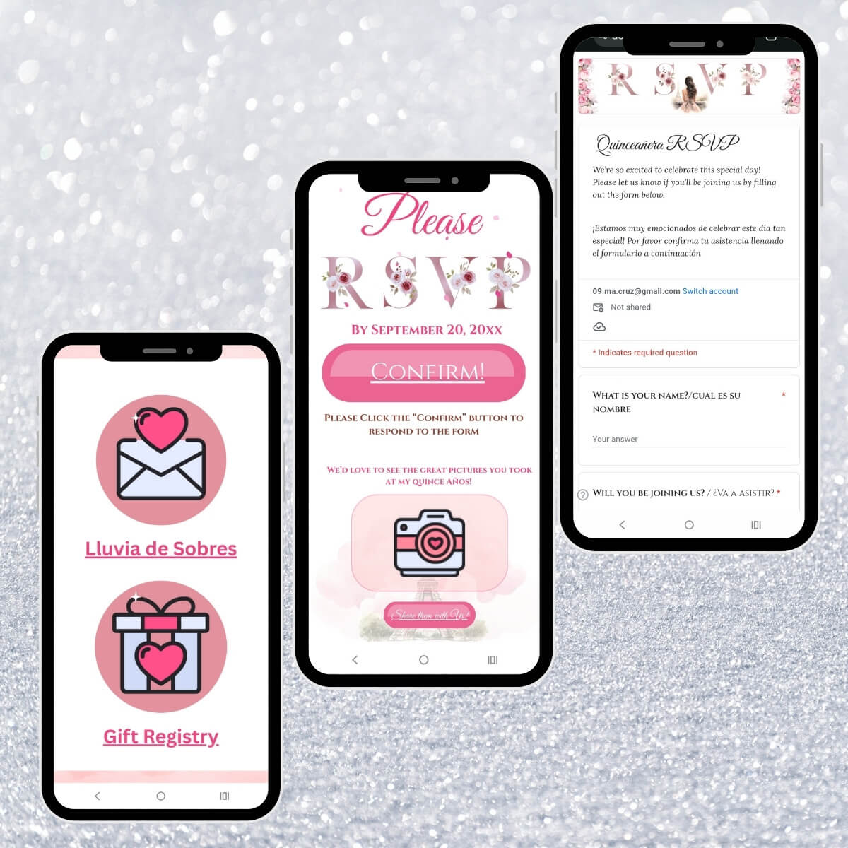 Create a beautiful, modern Pink and White Paris Quinceañera Website to keep all your celebration details in one elegant place. This template is designed to match your Pink Paris invitations and adds a stylish digital touch to your event. Please note that this website is optimized for mobile phone viewing, since most people will be viewing from their cell phones.