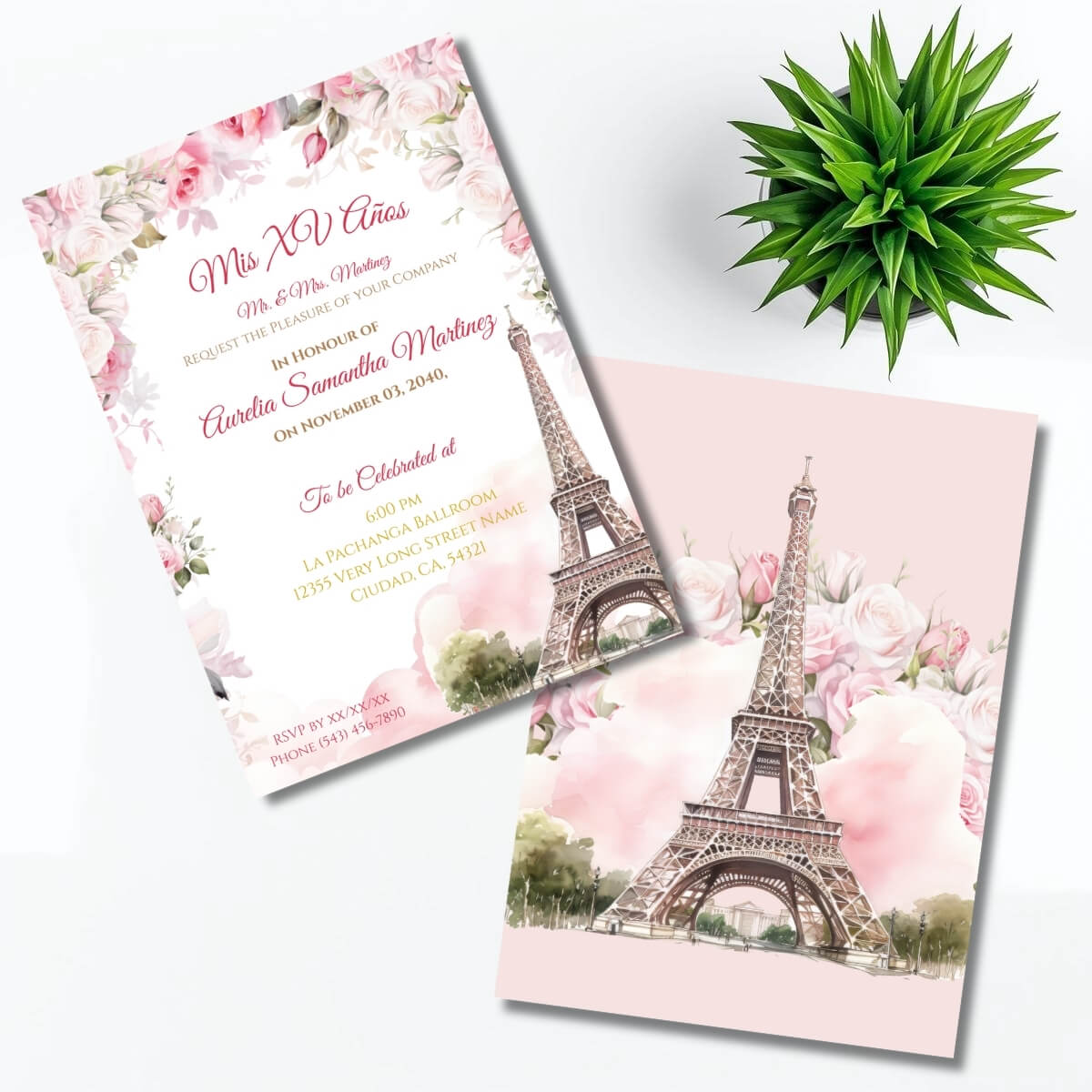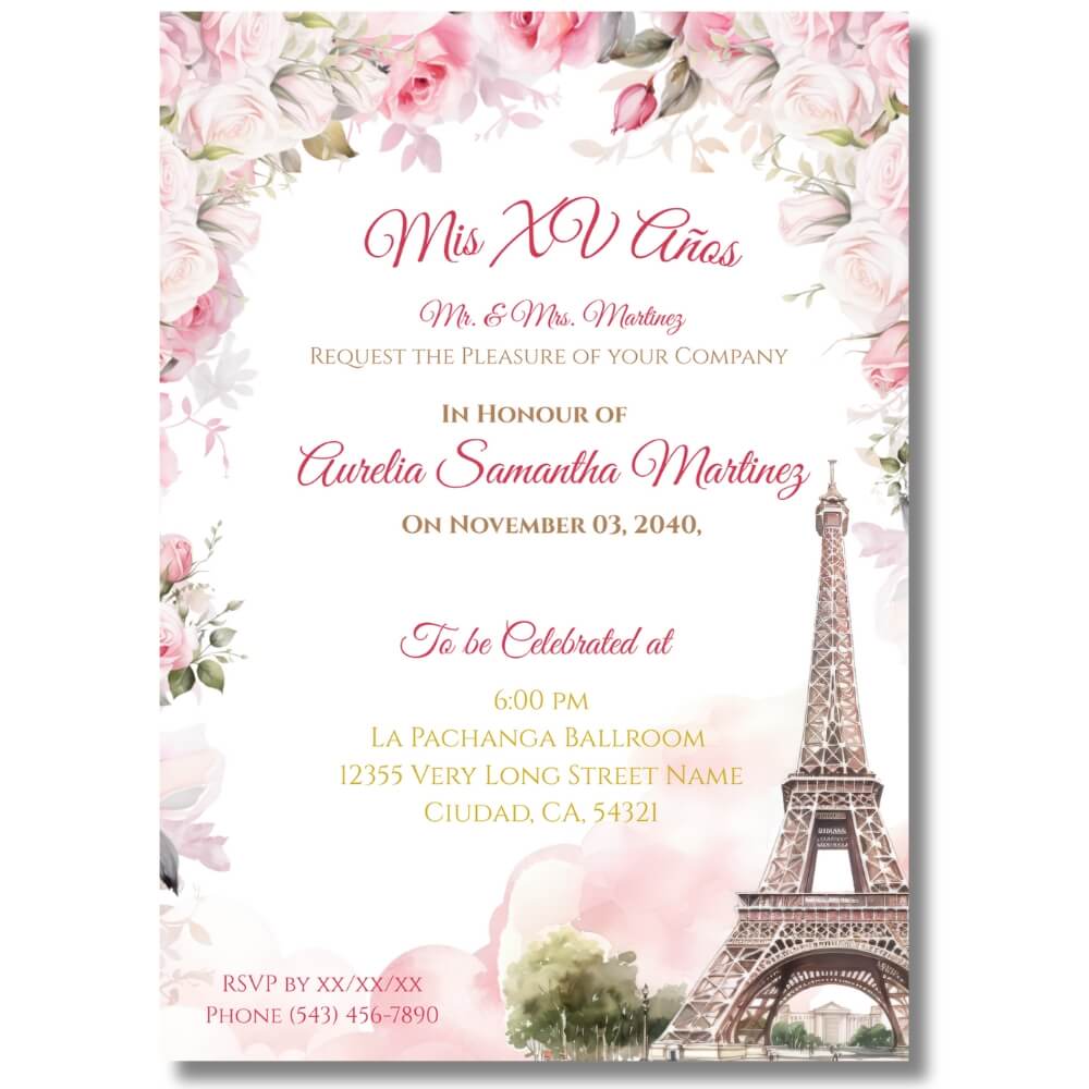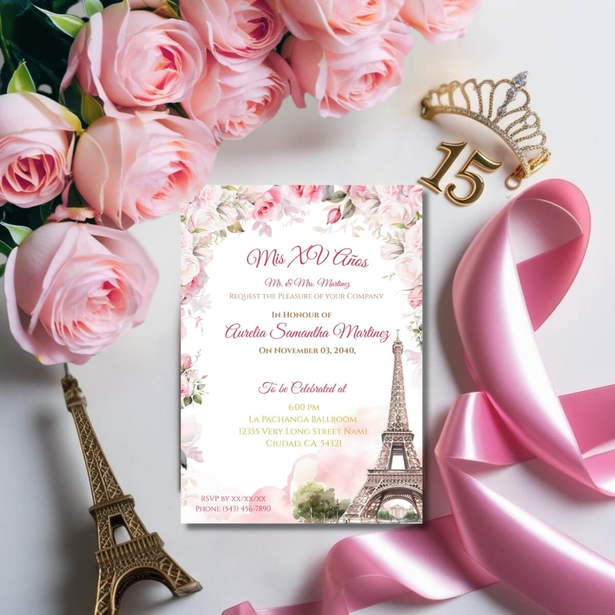 Celebrate in Parisian style with this Pink Paris Quinceañera Invitation. Easily edit your details in Canva using a free account, then download and print anywhere or share digitally. Perfect for Paris theme quinceañeras and sweet 15s.