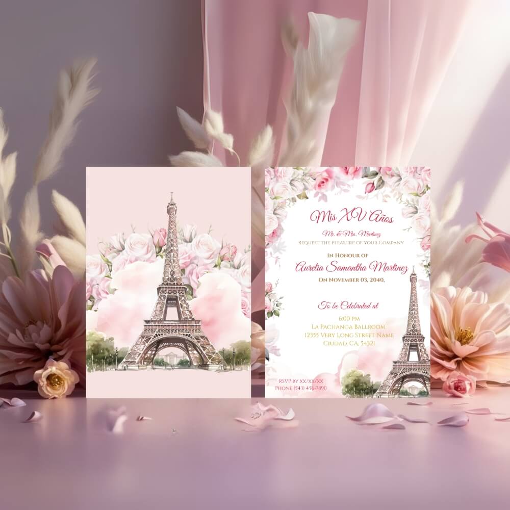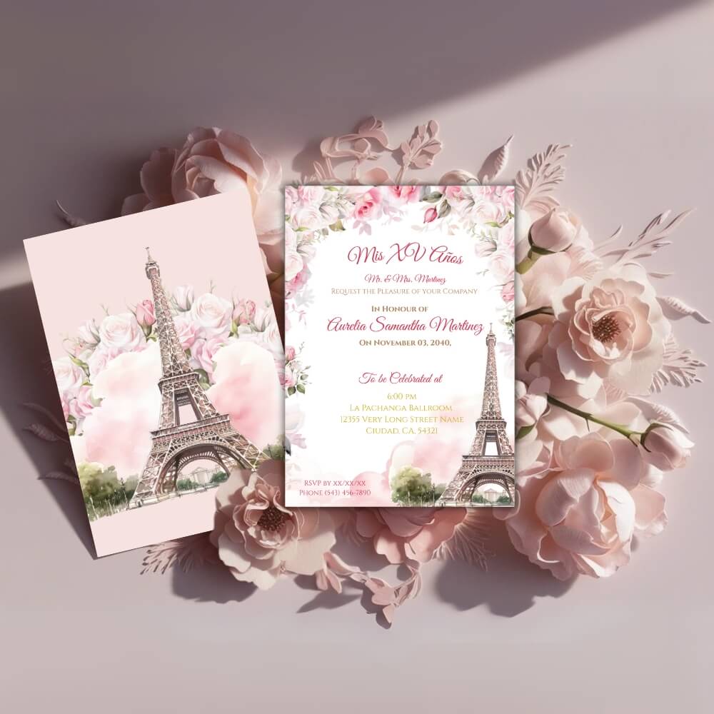 Bring Parisian charm to your celebration with this elegant Pink Paris Quinceañera Invitation. Designed in soft blush tones with stylish Paris details, this invitation is perfect for a Paris theme quinceañera or a sweet 15 filled with romance and glamour.