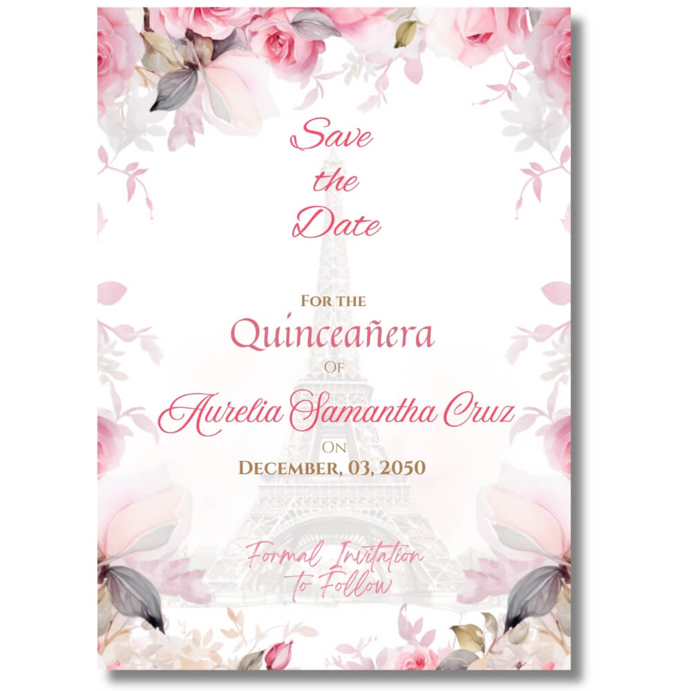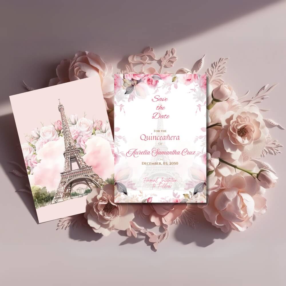 Announce your special day in style with this Pink Paris Save the Dates template. Featuring soft blush tones and Parisian accents, it’s the perfect way to let your guests know your quinceañera is coming!