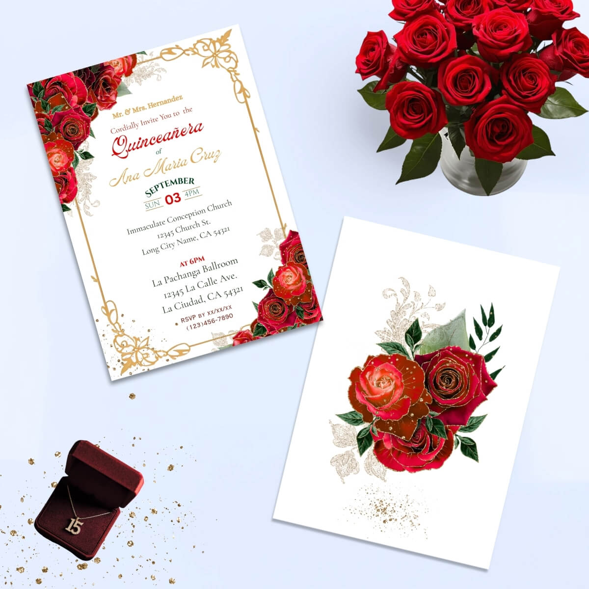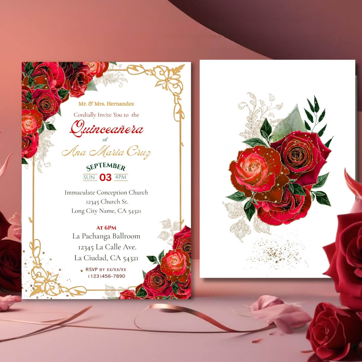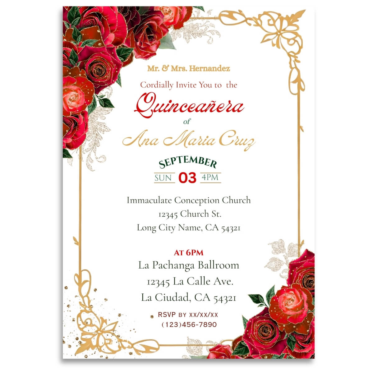 Red Roses Quinceañera Invitation with Gold Frame (5×7 Printable Template)