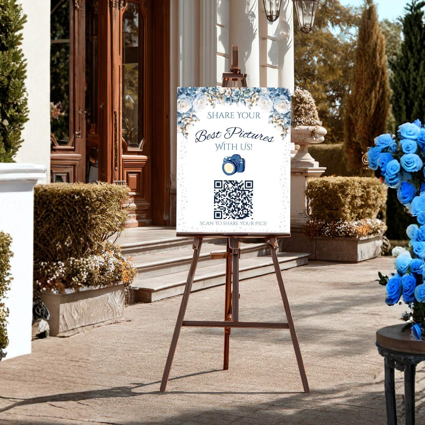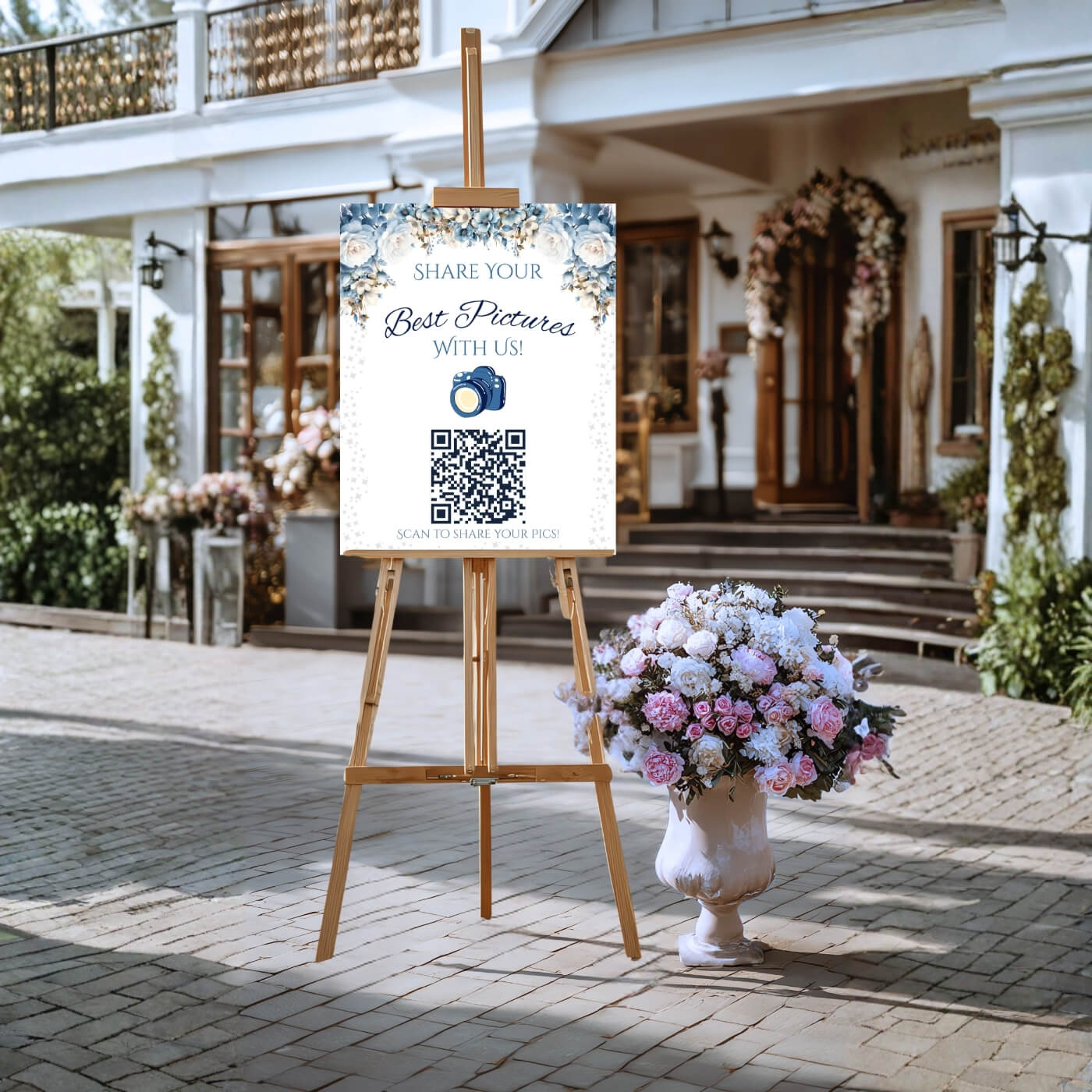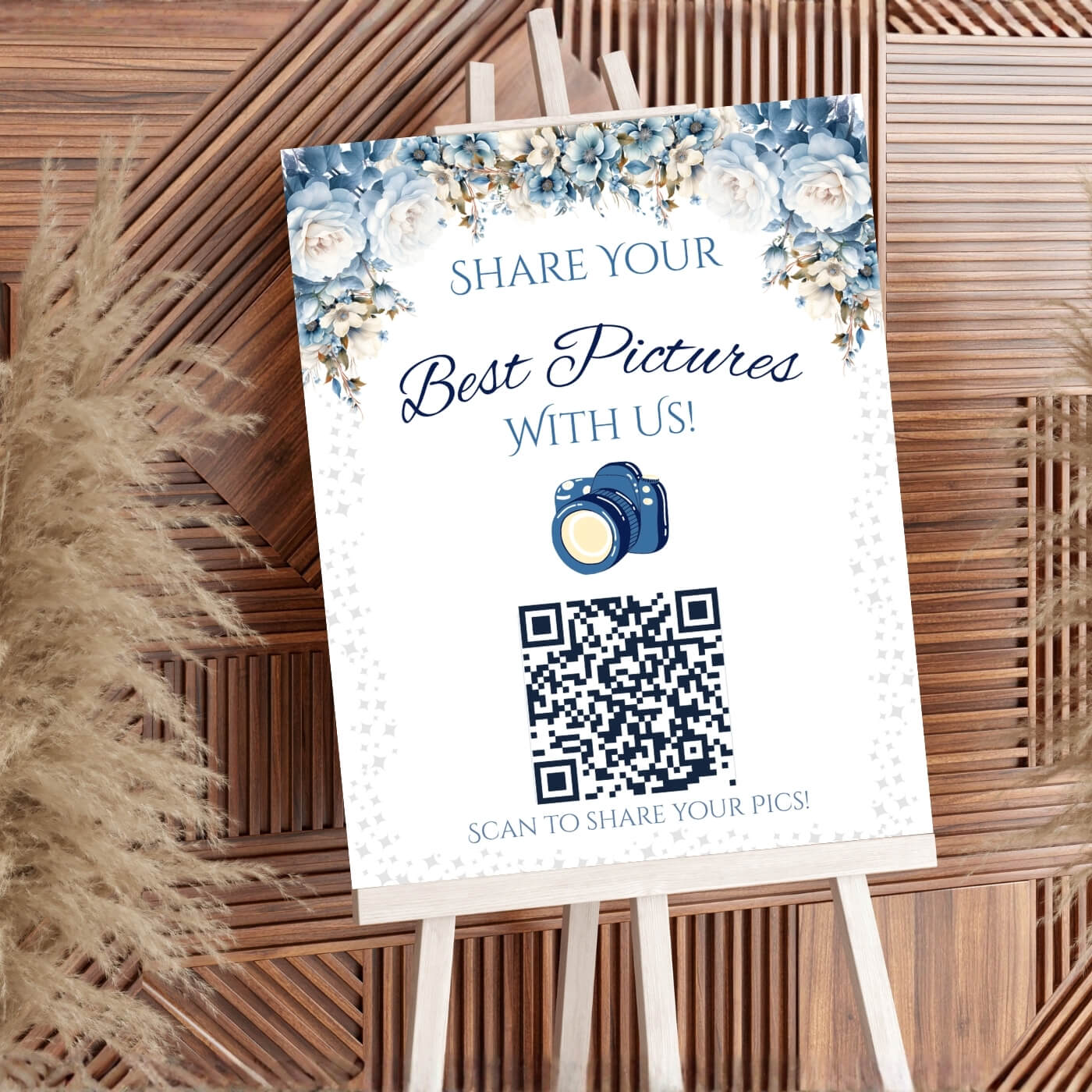 Let your guests become part of the celebration with this Winter Wonderland Photo Upload Sign for your quinceañera. Featuring elegant winter tones and delicate snowflake details, this sign includes a QR code so guests can easily upload their own photos from the event — capturing memories from every angle!